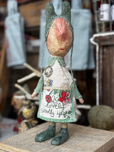 Julie works in papier mache, mixing vintage fabrics, scraps of poems and words she loves as well as knits and stitching to her dolls.