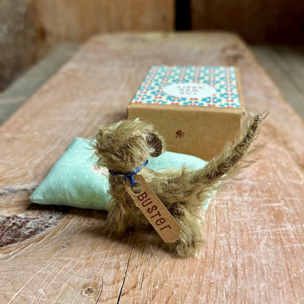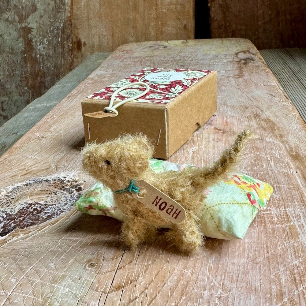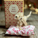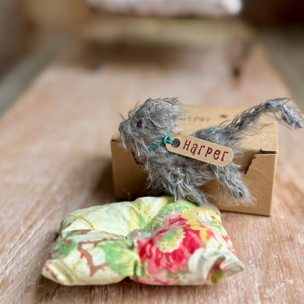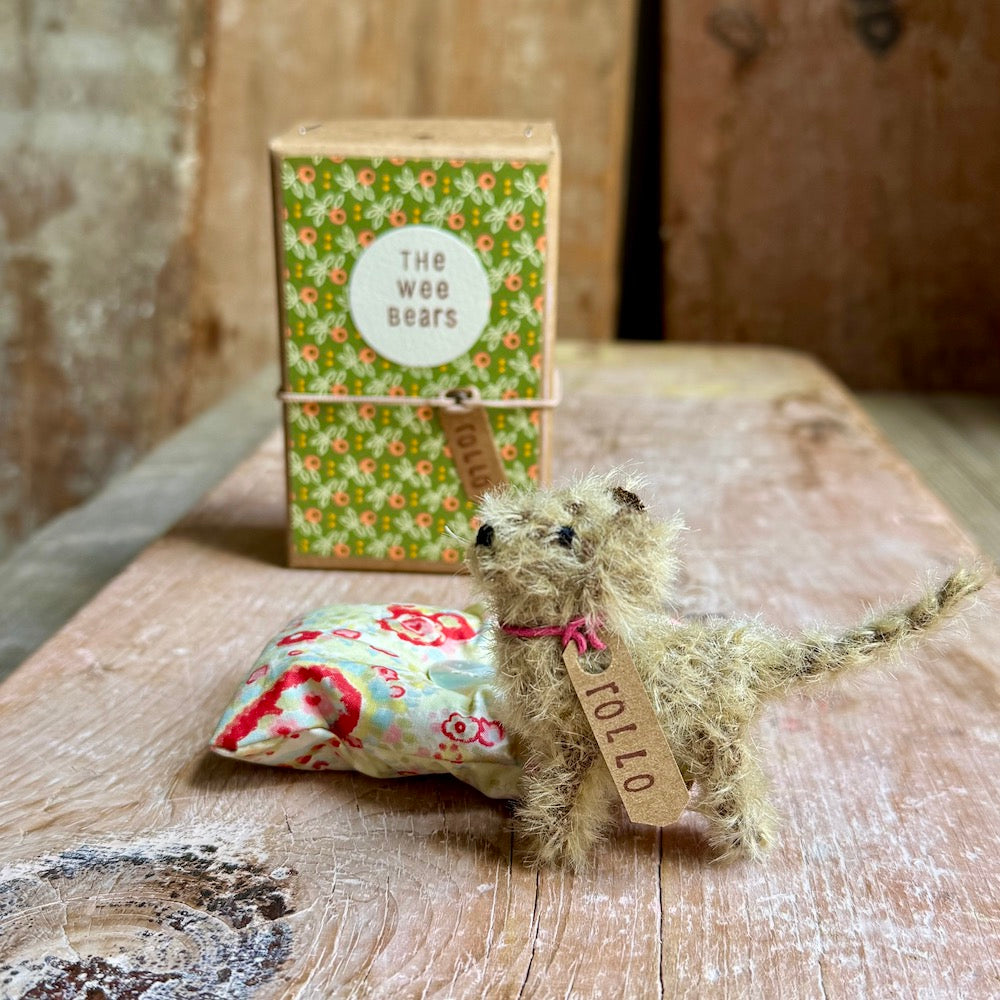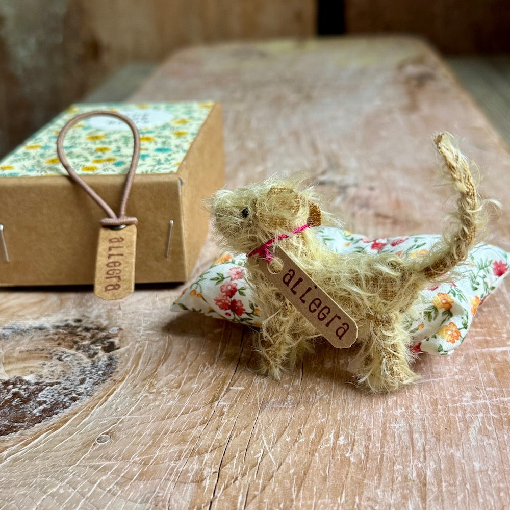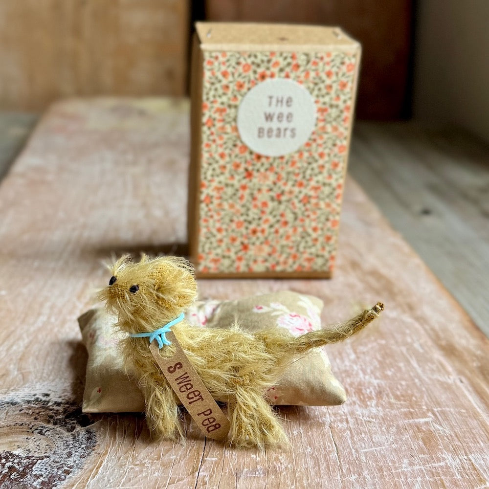 These adorable little dogs are about the same size as the wee bears, and they come in their own wee box with their name on the top, and a vintage fabric cushion.