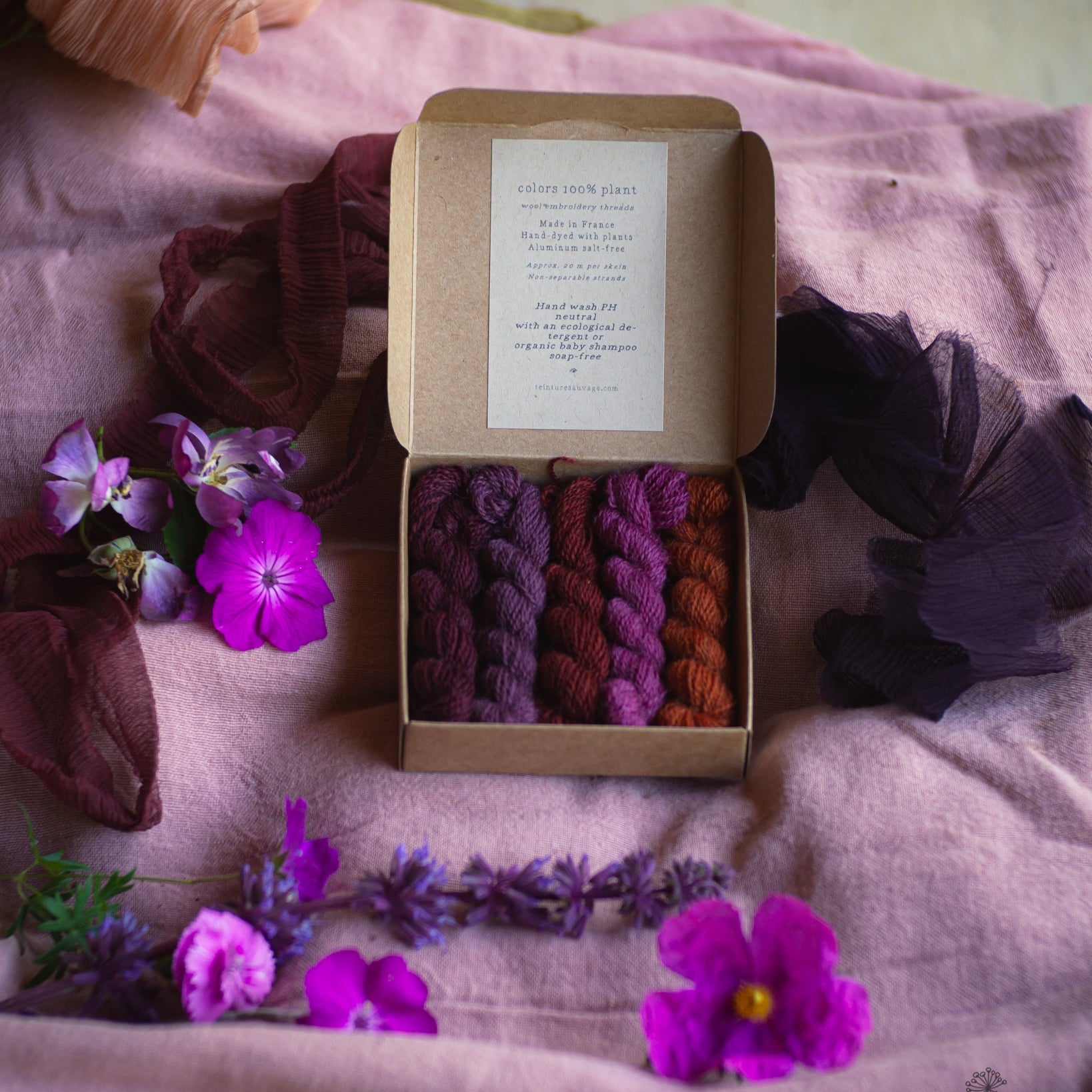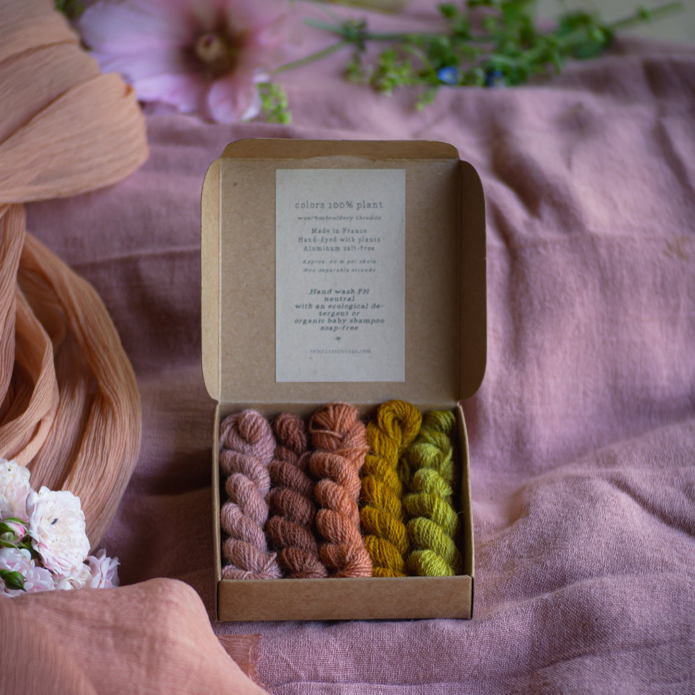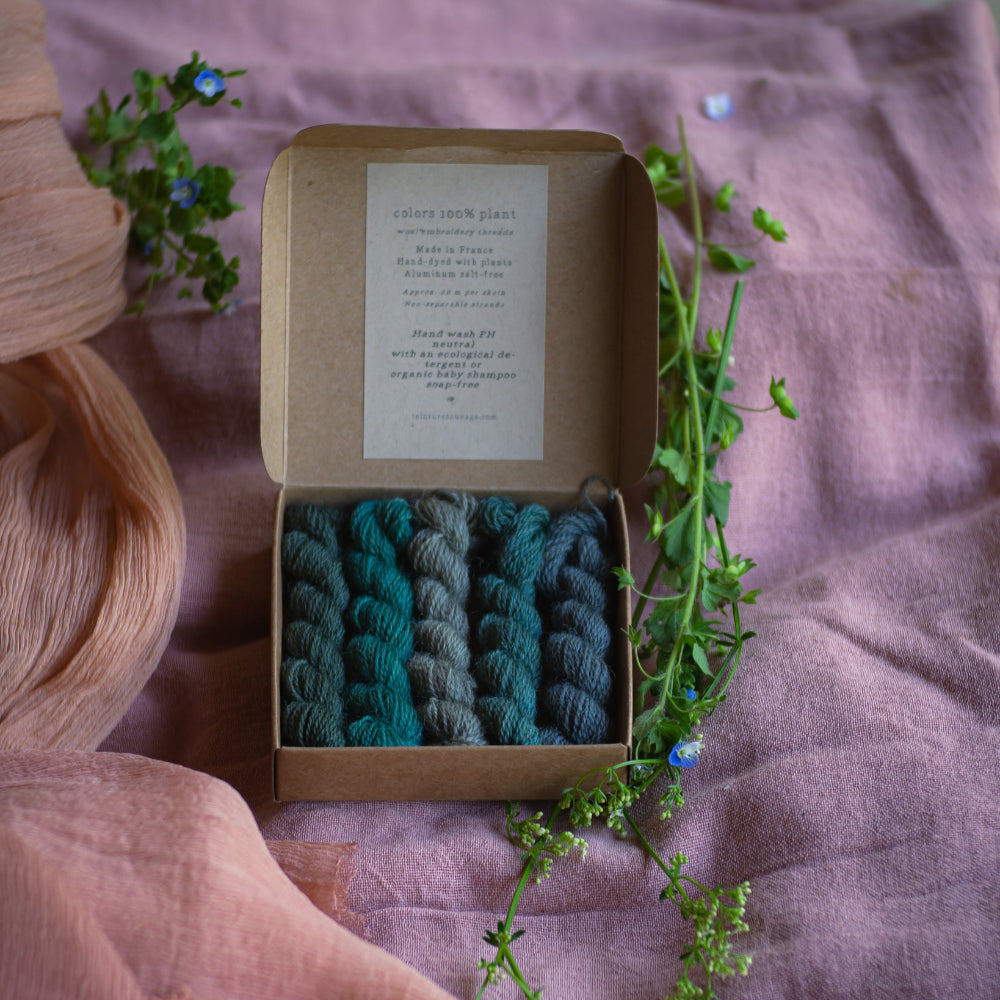 Each Box contains 5 -100% naturally dyed wool mini-skeins of embroidery thread.