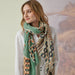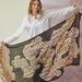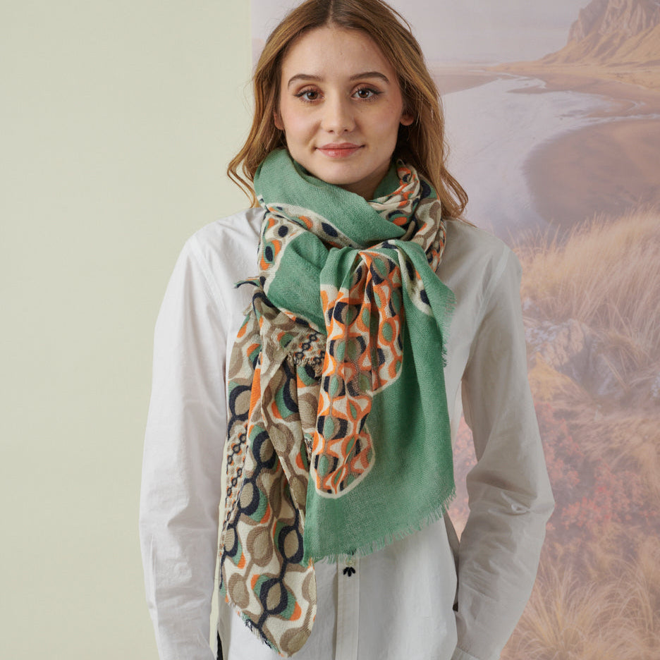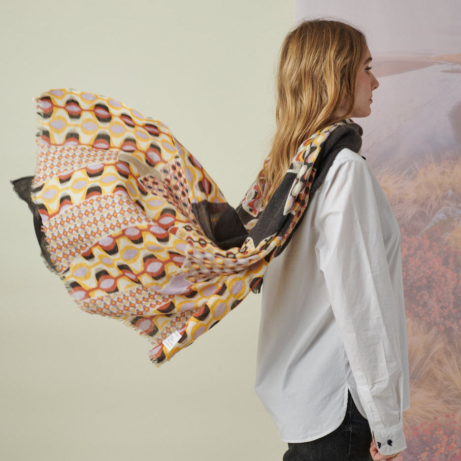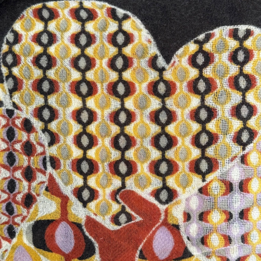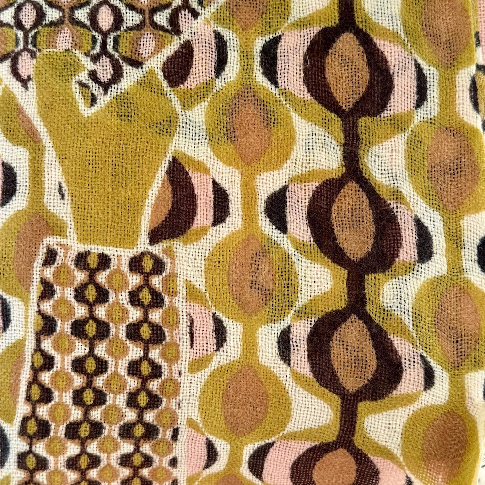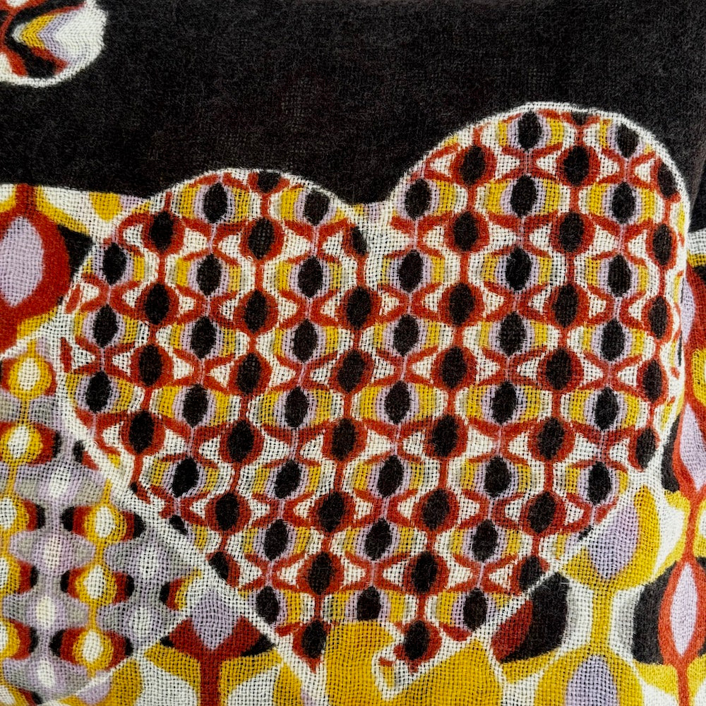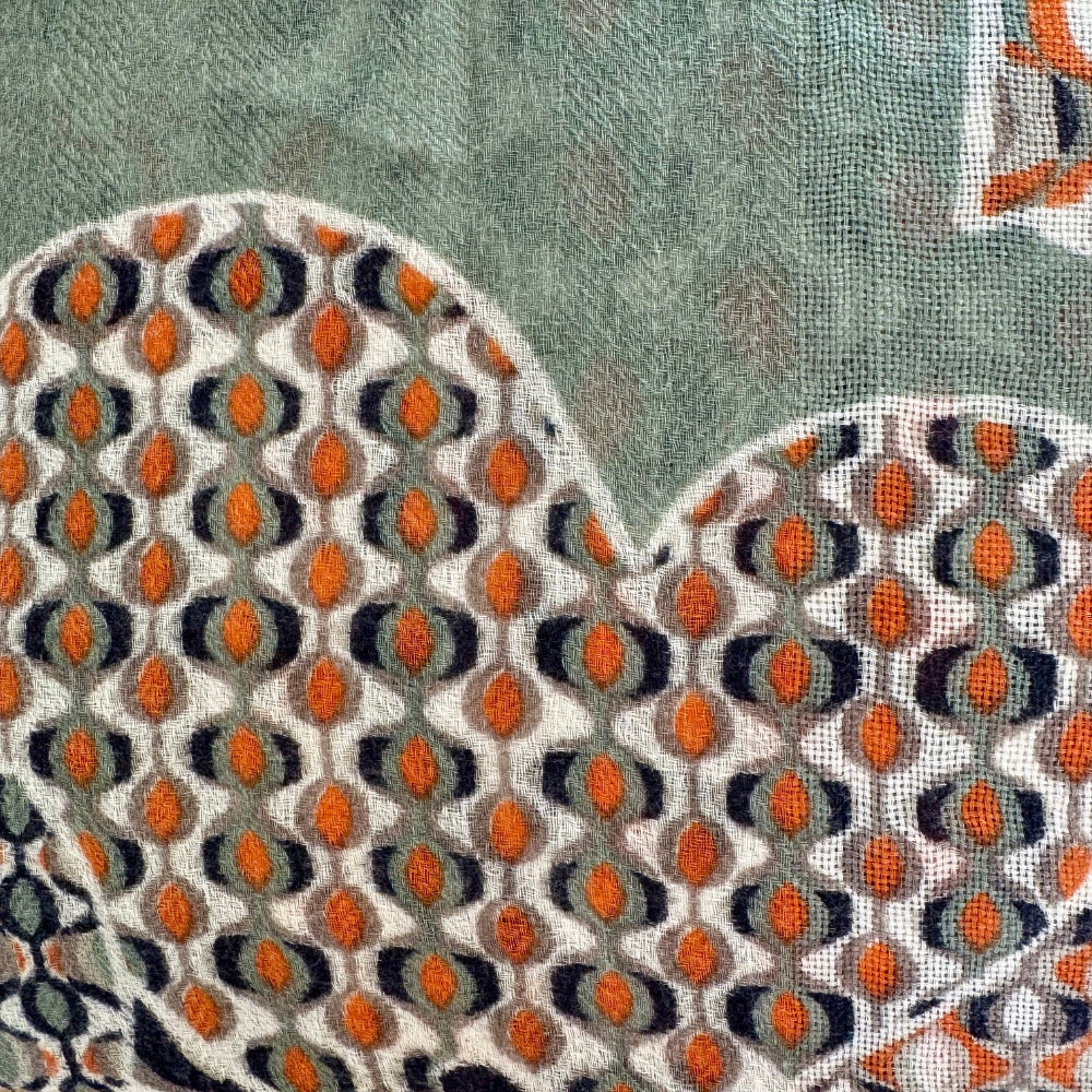 This is a fabulous, huge wool shawl in a very beautiful design. Designed in France, and printed in India. Lightweight, but cozy gorgeous wrap.