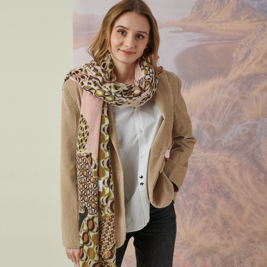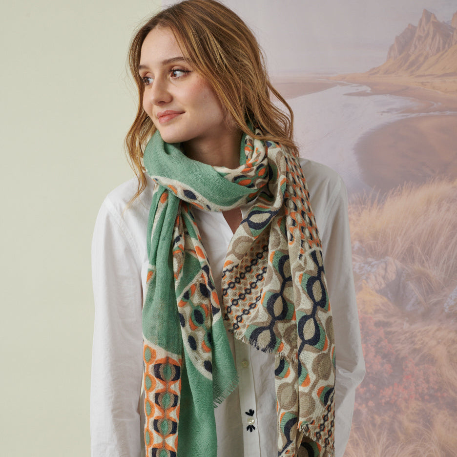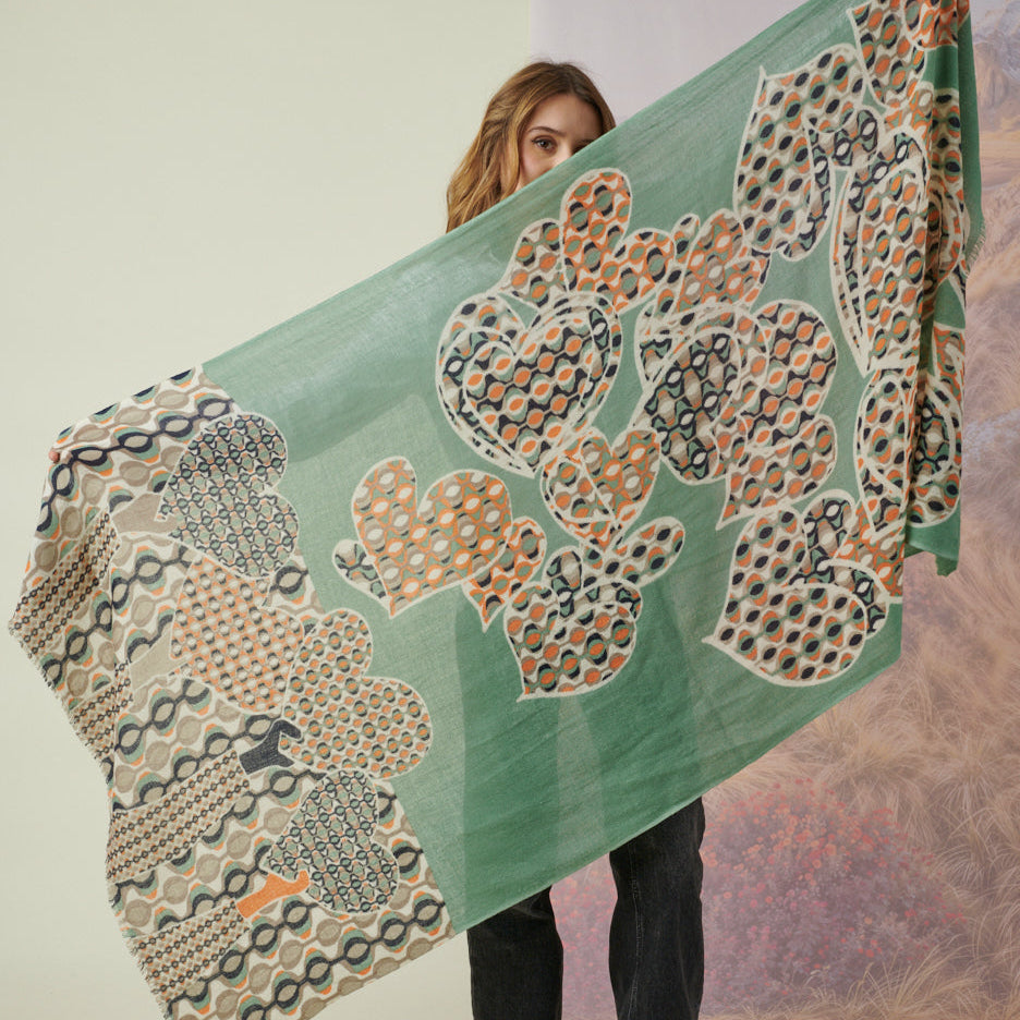 This luxurious wool scarf blends classic elegance with thoughtful, hand-crafted detail. sophistication to any outfit. Generously sized at 100 × 200 cm, it drapes effortlessly over the shoulders or can be worn as a standout accessory.