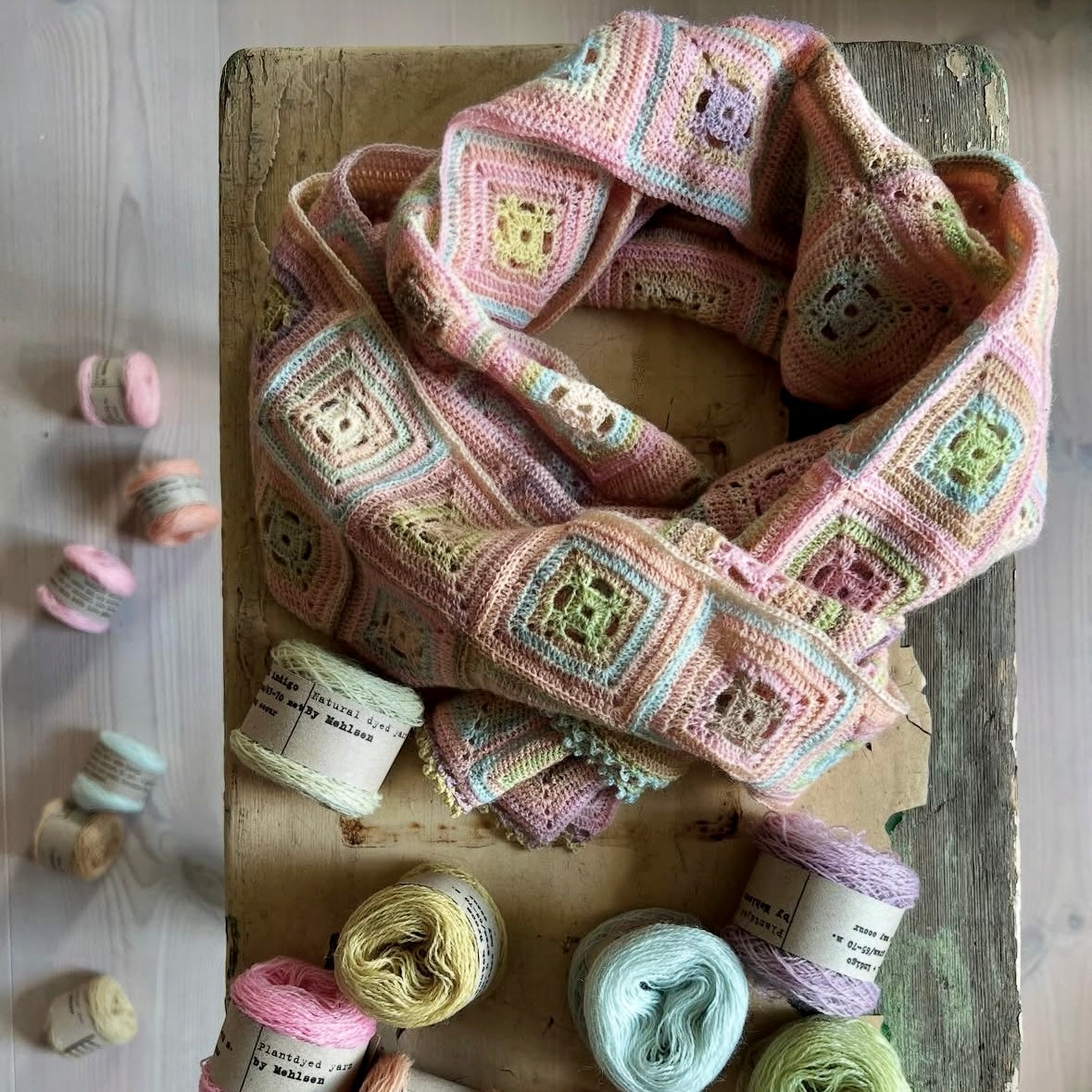 25 balls of Mehlsen plant-dyed yarn and the printed pattern.
