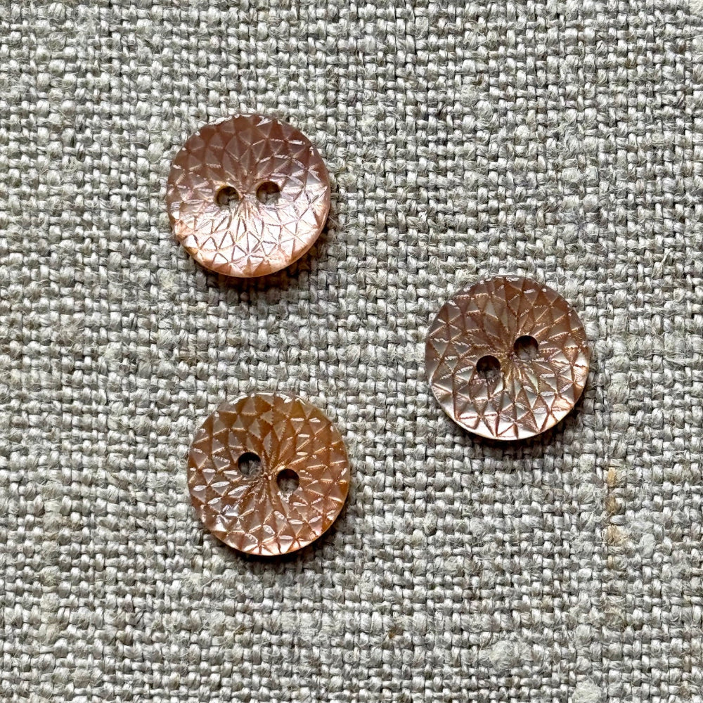 These buttons are crafted from the iridescent linings of oyster shells, giving them a unique charm with a beautiful and intricate laser -etched design. They are naturally durable and feature slightly different colours on each button.